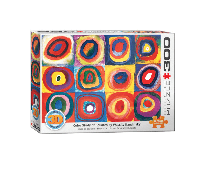 Ar šo puzli aplūkojiet Kandinska “Krāsu pētījumu” pavisam jaunā veidā.3D puzlēm ir ļoti unikāls efekts – tās izskatās atšķirīgi, skatoties no dažādiem leņķiem. Krāsu pētījums. Kvadrāti ar koncentriskiem apļiem 1913 Akvarelis, guaša un krītiņš uz papīra 9,4 × 12,4 collas (23,8 × 31,4 cm) Minhene, Städtische Galerie im Lenbachhaus. Kvadrāti ar koncentriskiem apļiem (Farbstudie – Quadrate und konzentrische Ringe), iespējams, atpazīstamākais Kandinska darbs, patiesībā nav pilnvērtīga glezna. Šis zīmējums ir neliels pētījums par dažādu krāsu kombināciju uztveri, ko gleznotājs izmantoja kā atbalsta materiālus savā radošajā procesā. Kandinskim krāsa nozīmēja vairāk nekā tikai gleznas vizuālo komponentu. Krāsa ir tās dvēsele. Savās grāmatās viņš ir detalizēti un ļoti poētiski aprakstījis savu pieeju krāsu mijiedarbībai savā starpā un ar skatītāju. Turklāt Kandinskis bija sinestēts, t. i., viņš spēja “dzirdēt krāsas” un “redzēt skaņas”. Jautra, izaicinoša un unikāli mīklaina pieredze visai ģimenei. Lielie lēcas formas elementi padara šīs puzles salikšanu par aizraujošu piedzīvojumu. Šī puzle ir ideāli piemērota gan mākslas entuziastiem, gan puzles mīļotājiem, un tā ir nepieciešama jūsu kolekcijā. 3D puzlēm ir ļoti unikāls efekts; tās izskatās atšķirīgi, raugoties no dažādiem leņķiem. Jautra, izaicinoša un unikāla puzles minšana visai ģimenei. Puzles izmēri ir 48,89 x 67,56 cm. 36 x 26 x 6,5 cm Svars 0,95 kg Jautra, izaicinoša un unikāla puzle visai ģimenei. Ieteicamais vecums: 8-108 gadi Nav piemērots bērniem līdz 3 gadu vecumam – daudz sīku detaļu. Citi eksperimentu komplekti. Globusi un kartes.