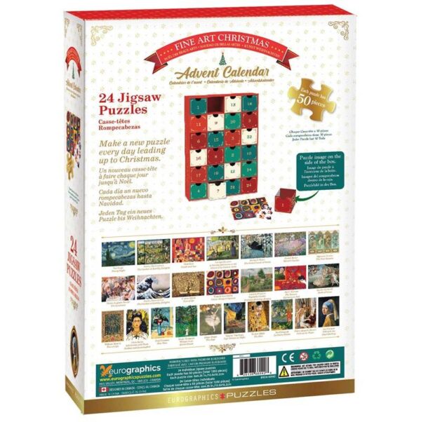 Kas ir kastē? Adventes kalendārs ar 24 kastītēm. Katrā lodziņā ir puzle. 24 atsevišķas puzles. Katra puzle sastāv no 50 gabaliņiem (kopā 1200 gabaliņi) Katras puzles izmērs: 12,5 cm x 12,5 cm JAUNUMS! Grāmatas stils. XL kastes dizains! Adventes kalendāra kastīte: 36,83 cm x 36,83 cm x 8,25 cm Ilustrējis mākslinieks Simon Treadwell Vecums 13+ Apraksts. Šajā unikālajā kolekcijā ir 24 miniatūras puzles, katra pa 50 gabaliņiem, ar dažādiem pasaules slavenāko mākslinieku meistardarbiem. Aiz katras atvilktnes jūs atklāsiet apbrīnojamus darbus, piemēram, Van Goga “Zvaigžņotā nakts”, Leonardo da Vinči “Mona Liza” un daudzus citus! Tas ir lielisks veids, kā izbaudīt mazliet radošuma un elegances katru dienu pirms Ziemassvētkiem. Šis adventes kalendārs ir lieliski piemērots gan mākslas mīļotājiem, gan puzles entuziastiem, jo sniedz mazliet mākslas jūsu svētkos. 24 pārsteiguma puzles pa 50 gabaliņiem katrā (kopā 1200 gabaliņi) Katru dienu, tuvojoties Ziemassvētkiem, izveidojiet jaunu puzli! Jautrs un radošs veids, kā svinēt Ziemassvētku atpakaļskaitīšanu Visu mini puzļu attēli ir uz kastes aizmugures. Izgatavotas no augstas kvalitātes, precīzi izgrieztām Eiropas Blueboard detaļām, lai puzle sagādātu prieku. Ideāli piemērots visai ģimenei: kopā radiet jaunas atmiņas, veicinot prieku, pacietību un nepacietību visas sezonas garumā. 1,77 kg Ražots Kanādā un ASV Vairāk adventes kalendāru meklējiet šeit. Skatiet mūsu globusus un kartes šeit.
