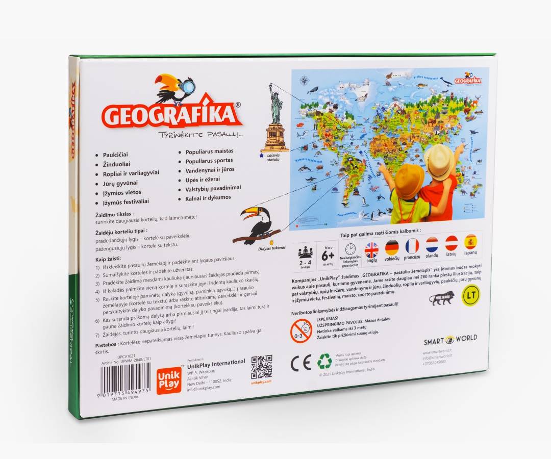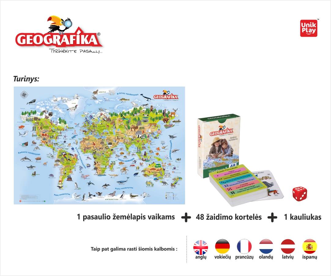 Mūsu zīmola Geografika kartes apvieno vienkāršu kartogrāfiju un vieglu spēli, lai jau 6 gadus veci bērni varētu uzzināt vairāk par valstīm, kontinentiem, okeāniem, upēm, pilsētām, dzīvniekiem, putniem un daudz ko citu. Izpētiet pasauli: bērnu pasaules karte ir jautrs veids, kā mācīt bērniem par pasauli, kurā mēs dzīvojam. Šajā kartē ir vairāk nekā 280 ilustrāciju, tostarp valstis, upes, ezeri, okeāni, orientieri, zīdītāji, rāpuļi, abinieki un putni. Jūs varat aplūkot visdažādākos dzīvniekus un slavenas vietas, svētkus, sporta veidus vai ēdienus! Spēle un tās saturs ir lietuviešu valodā. Spēles kastītē ir ūdensnecaurlaidīga, nesaplēšama karte, 48 spēļu kartes, 1 kauliņš. 2-4 spēlētājiem vecumā no 6 gadiem. Spēli var spēlēt divos grūtības līmeņos: tiem, kuri vēl neprot lasīt, var izmantot zīmējumus uz kartītēm, bet tiem, kuri jau prot lasīt, ir pieejami rakstiskie jautājumi. Mērķis ir uzminēt pēc iespējas vairāk un tādējādi savākt visvairāk kāršu, lai uzvarētu! Neierobežotas izklaides stundas, iepazīstot pasauli! 37 x 27 x 3 cm Pieejams 3 valodās: lietuviešu, latviešu un angļu. Visi mūsu globusi un kartes. Citas galda spēles.