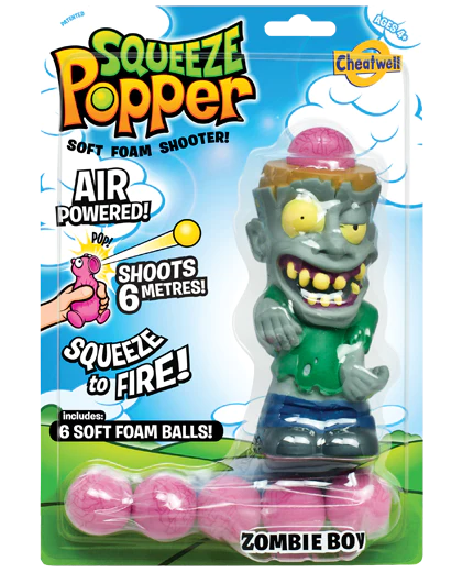 Ielieciet Popperam mīkstu bumbiņu, nospiediet viņa vēderu un šaujiet! Jo spēcīgāk saspiedīsi, jo tālāk tā aizlidos – vairāk nekā 6 metrus! Īpaši mīkstās putuplasta bumbiņas padara Squeeze Poppers drošu rotaļām gan telpās, gan ārā. Komplektā ir 1x šāvējs, 6x bumbiņas Izmēri (mm): 255 x 175 x 80 Piemērots vecumā no 4 gadiem https://www.youtube.com/watch?v=cRmW2uexc58 Visus Squeeze Popper šāvējus atradīsiet šeit.