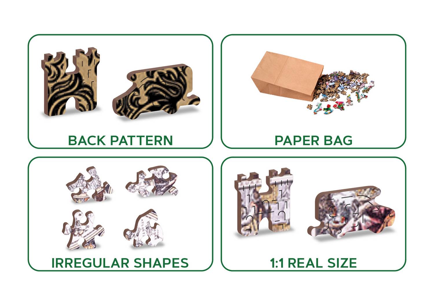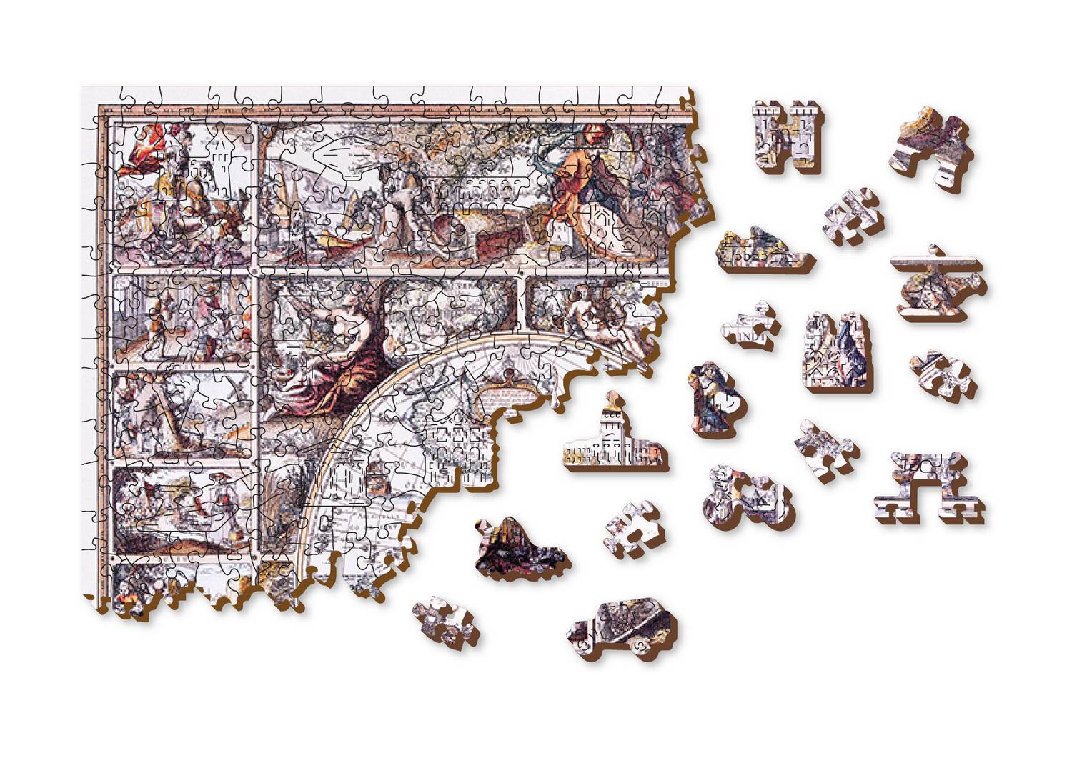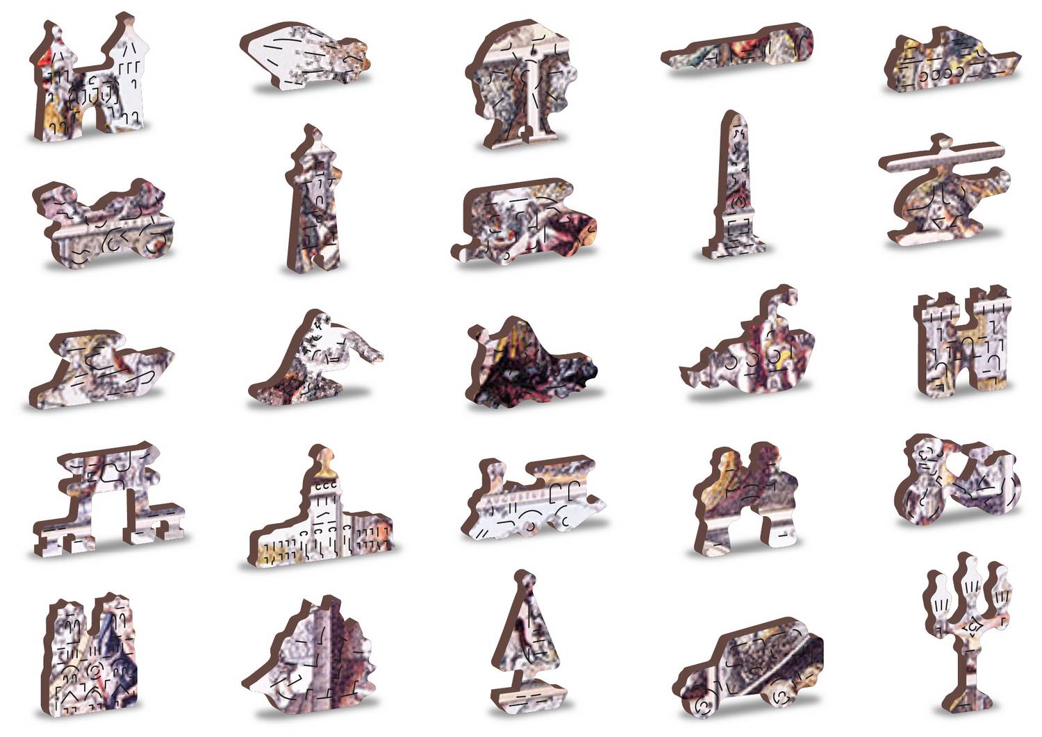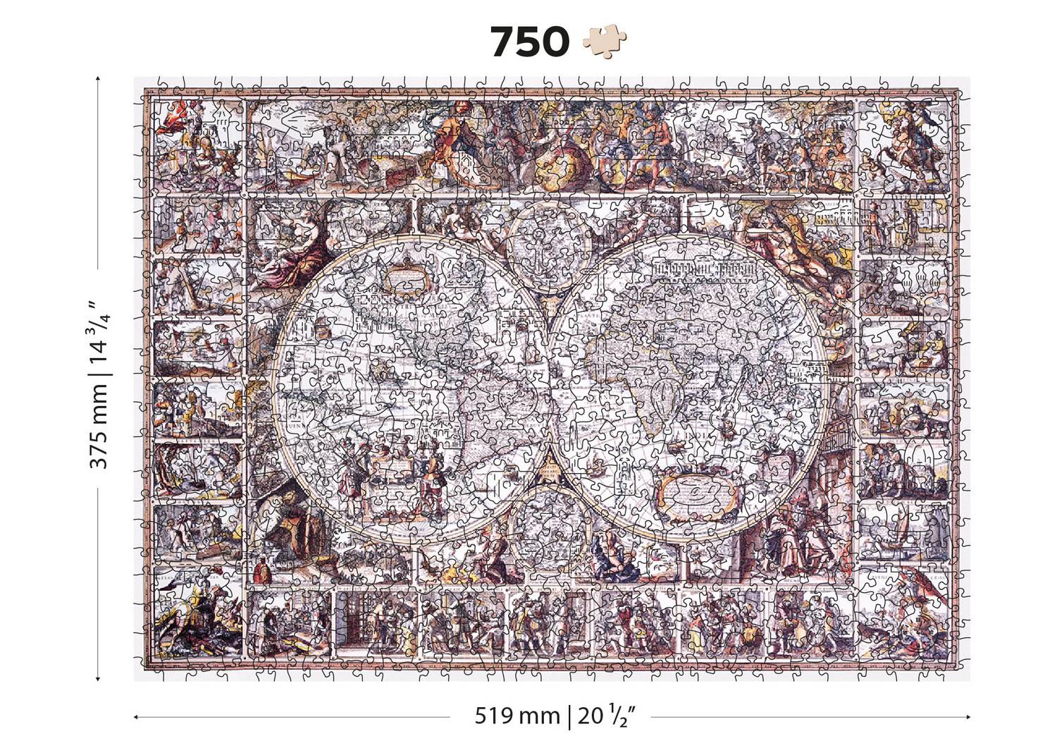 Koka puzle ar abpusējiem gabaliņiem Gabaliņu skaits: 750, ar 75 unikālas formas gabaliņiem Risināšanas laiks: 480 minūtes Saliekamais izmērs: 519×375 mm Vecuma diapazons: 12+ Lieliski piemērots dāvināšanai Apstiprināts un sertificēts: CE, EN-71, ASTM D-4236 Izgatavots no 100% bērniem drošiem materiāliem Ražots ES.