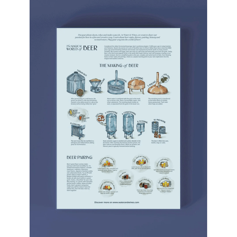 Dodieties iespaidīgā alus piedzīvojumā ar mūsu rūpīgi izstrādāto puzli. Šī mākslinieciski ilustrētā puzle, kas veltīta vienam no pasaulē iecienītākajiem dzērieniem, aizvedīs jūs ceļojumā pa vairāk nekā 100 alus stiliem un kategorijām. Papildus burvīgajam puzles dizainam kastē ir iekļauts arī ievads par alus darīšanas pamatiem un alus saderību, kā arī ilustrēts alus glāžu ceļvedis un visaptveroša alus garšu karte. Esiet gatavi iedziļināties šajā burvīgajā un aromātiskajā visumā pa vienam puzles gabaliņam. Katrai puzlei ir pievienots mūsu dizaina pilnformāta plakāts un kastes statīvs. Izgatavotas ES no vietējās izcelsmes pārstrādāta papīra, ievērojot visstingrākos vides standartus. Par katru pārdoto preci mēs iestādīsim koku un ziedosim to droša dzeramā ūdens pieejamības uzlabošanai visā pasaulē. 1000 gabaliņu Svars: 794 grami Augstums: 24 cm Platums: 35 cm Salocītas puzles izmēri: 48 x 68 cm Vecums: 8-108 gadi Nav piemērots bērniem līdz 3 gadu vecumam – daudz mazu gabaliņu Ražotāja valsts: Nīderlande Visas mūsu puzles var atrast šeit. Ja meklējat unikālas globusus un kartes, lūdzu, apmeklējiet mūsu citu e-veikalu www.gaubliai.lt.