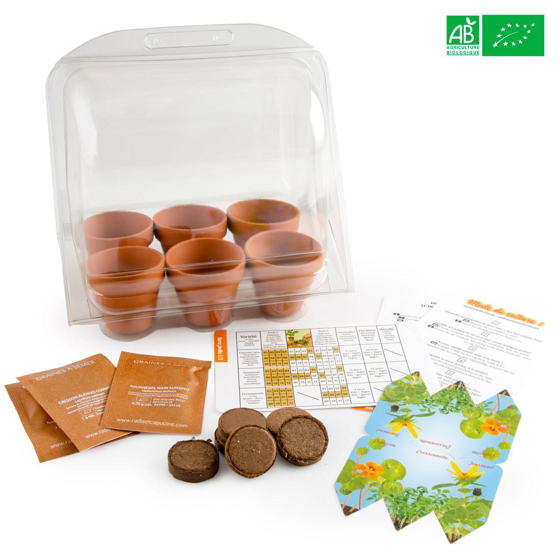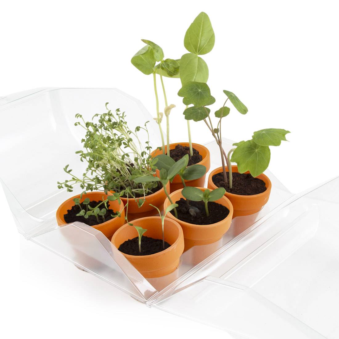 Jautra dārzkopība bērniem. 6 siltumnīcas ar 6 augsnes podiem katrā, lai jūs varētu diedzēt dažādas sugas. Jūsu bērni var iepazīt dārzkopību un audzēt savus augus telpās, lai pagatavotu lieliskus salātus! Šis mini dārziņš ir paredzēts stādīšanai kopā ar bērniem. Plastmasas siltumnīcas ir izglītojoša spēle, lai iepazītu dabu un augus! Jūs varat audzēt stādus audzēšanas podos. Jūsu dārzs jūs gaida, un bioloģiskās sēklas sniegs jums gardus dārzeņus un aromātiskus augļus. Plastmasas siltumnīcas ir īpaši izstrādātas, lai nodrošinātu sēklām labu dīgtspēju, nepieciešamo mitrumu un siltumu. Apgaismotas, ārpus loga, tās palīdz radīt tropu miniklimatu. Mini siltumnīcas 6×6 podi manam pirmajam bērnu dārzam. 6 terakotas podi, 6 cm diametrā – 6 kokosriekstu augsnes kapsulas diedzēšanai, 6 gabali katrā komplektā, kopā 6 komplekti. 6 iepakojumi ar bioloģisko saulespuķu sēklām, lai iegūtu skaistu dzeltenu ziedu, kas kustas līdzi saulei. 6 paciņas pundurziedu nasturcijas sēklu, kas ir ēdami ziedi. 6 paciņas ar bioloģiski audzētu krūmcidoniju sēklām, kas visos gadalaikos izaug tikai 3 dienās! *Sēklas no bioloģiskās lauksaimniecības. LT-BIO-01