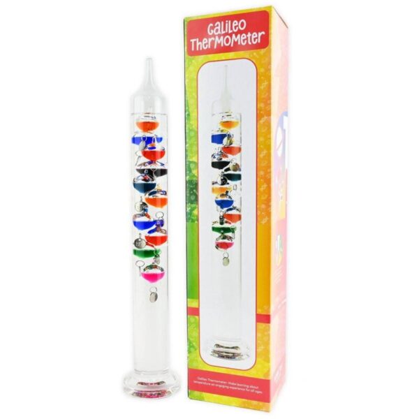 Galileo termometrs sastāv no stikla cilindra, kas piepildīts ar šķidrumu. Tajā peld krāsainas ar šķidrumu pildītas stikla lodītes. Šīs sfēras peld, peld vai balstās uz dibena. Palielinoties šķidruma temperatūrai caurulē, šķidruma blīvums samazinās un līdz ar to samazinās arī lodīšu peldspēja. Peldošās lodītes nogrimst, bet peldošās lodītes sāk peldēt. Termometrs ir nosaukts fiziķa Galileo Galileja vārdā, kurš atklāja principu, ka šķidruma blīvums mainās atkarībā no temperatūras. Galileo termometrs ir skaists un fiziski interesants dekoratīvs elements dzīvojamā istabā, kas vizuāli norāda aptuveno temperatūru telpā. Ideāla dāvana estētiem labi iekārtotā dzīvojamā istabā. Termometra augstums: 43 cm Temperatūras rādījums: no 16 līdz 34° Ieteicamais vecums: no 8 gadiem. Nav piemērots bērniem līdz 3 gadu vecumam, jo izstrādājums ir izgatavots no stikla un var saplīst vai radīt traumas. UZMANĪBU: Šis izstrādājums ir izgatavots no stikla, tāpēc, to lietojot, esiet uzmanīgi, jo stikla lauskas var radīt traumas. Zviedrija Lai uzzinātu vairāk par mūsu teleskopiem, noklikšķiniet šeit. Vairāk mūsu globusu un diagrammu šeit.